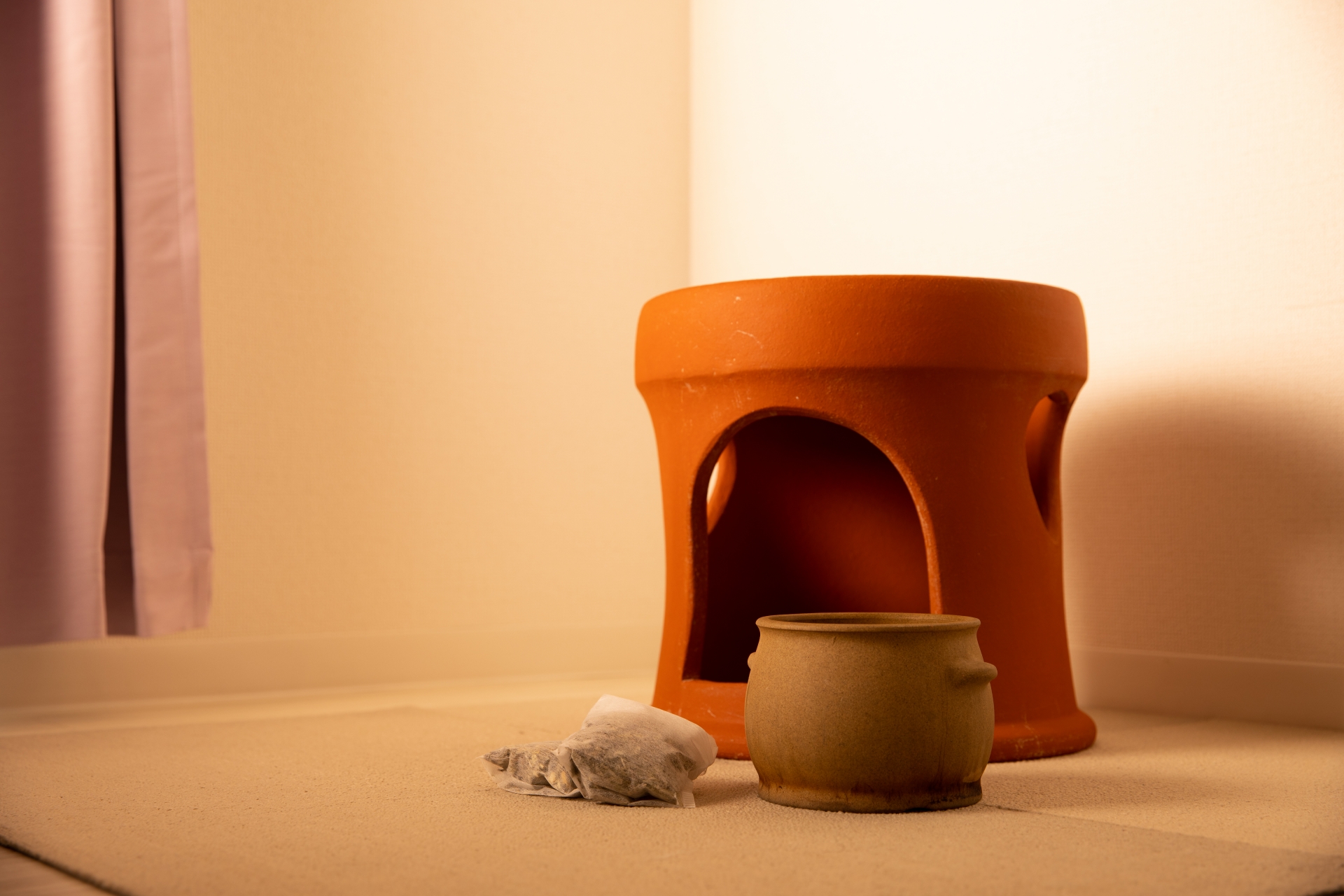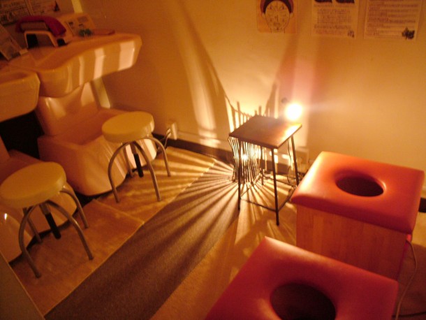 - 専用のイス(内部に煮えたぎるよもぎの鍋があって、イスの上部の穴からスチームが出るようになっている)に座る