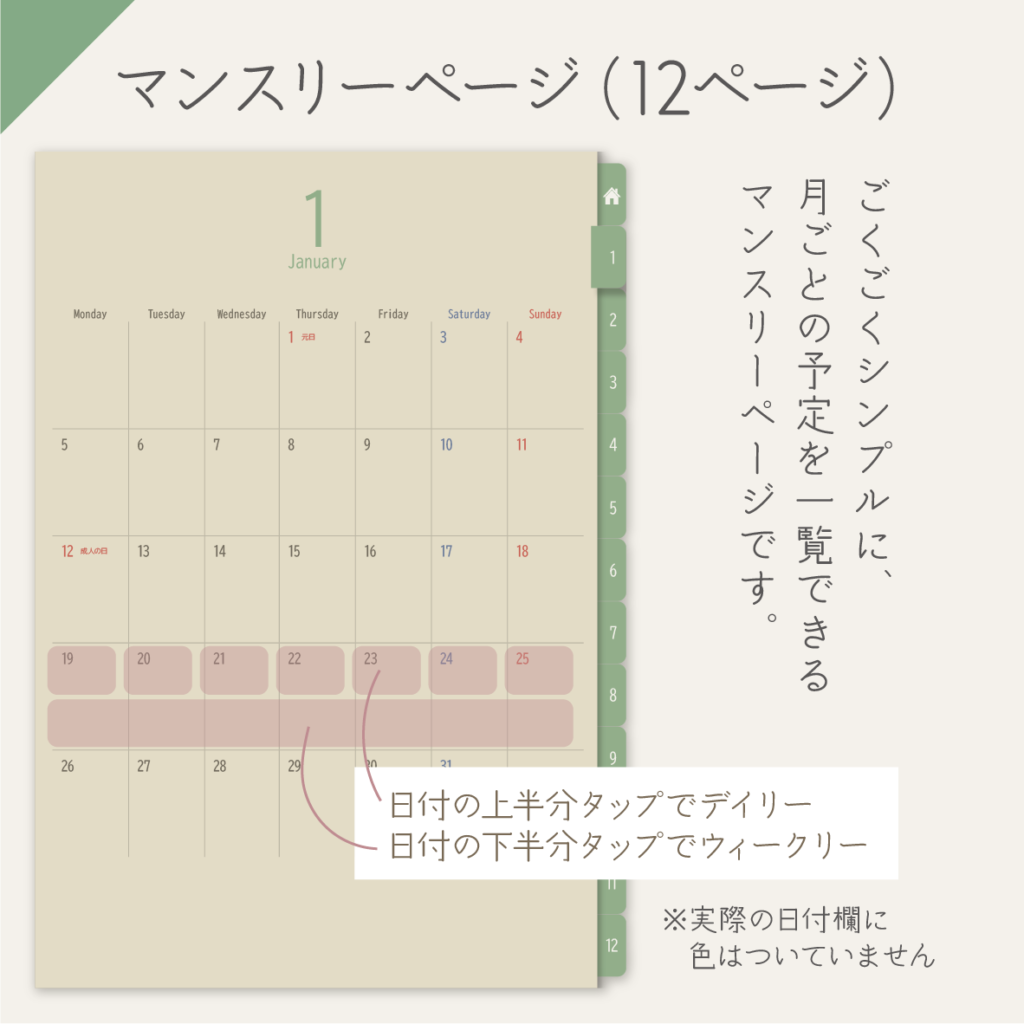 - 年間カレンダー カレンダーをタップするだけで、すぐにマンスリーページに移動可能。