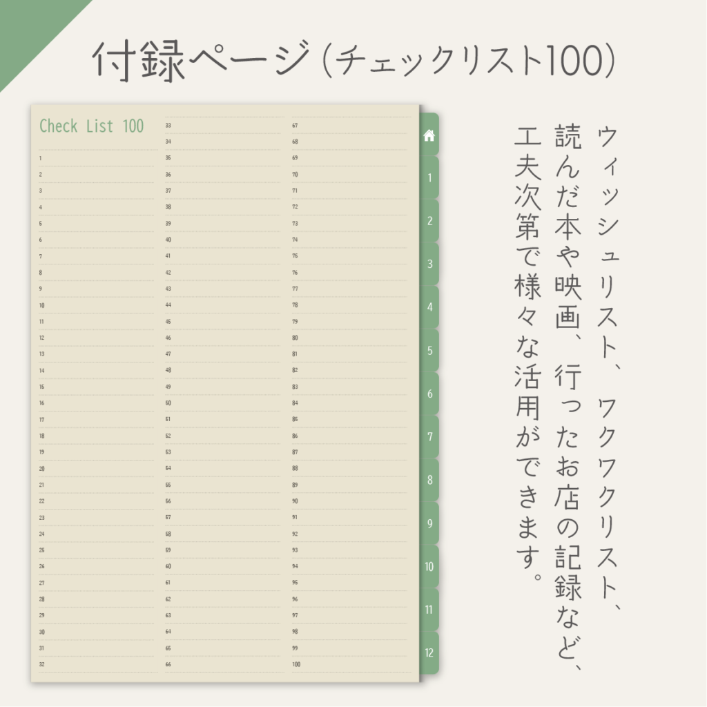 - 付録1:チェックリスト100 自由に使えるリストで目標管理や買い物リストなどに活用できます。