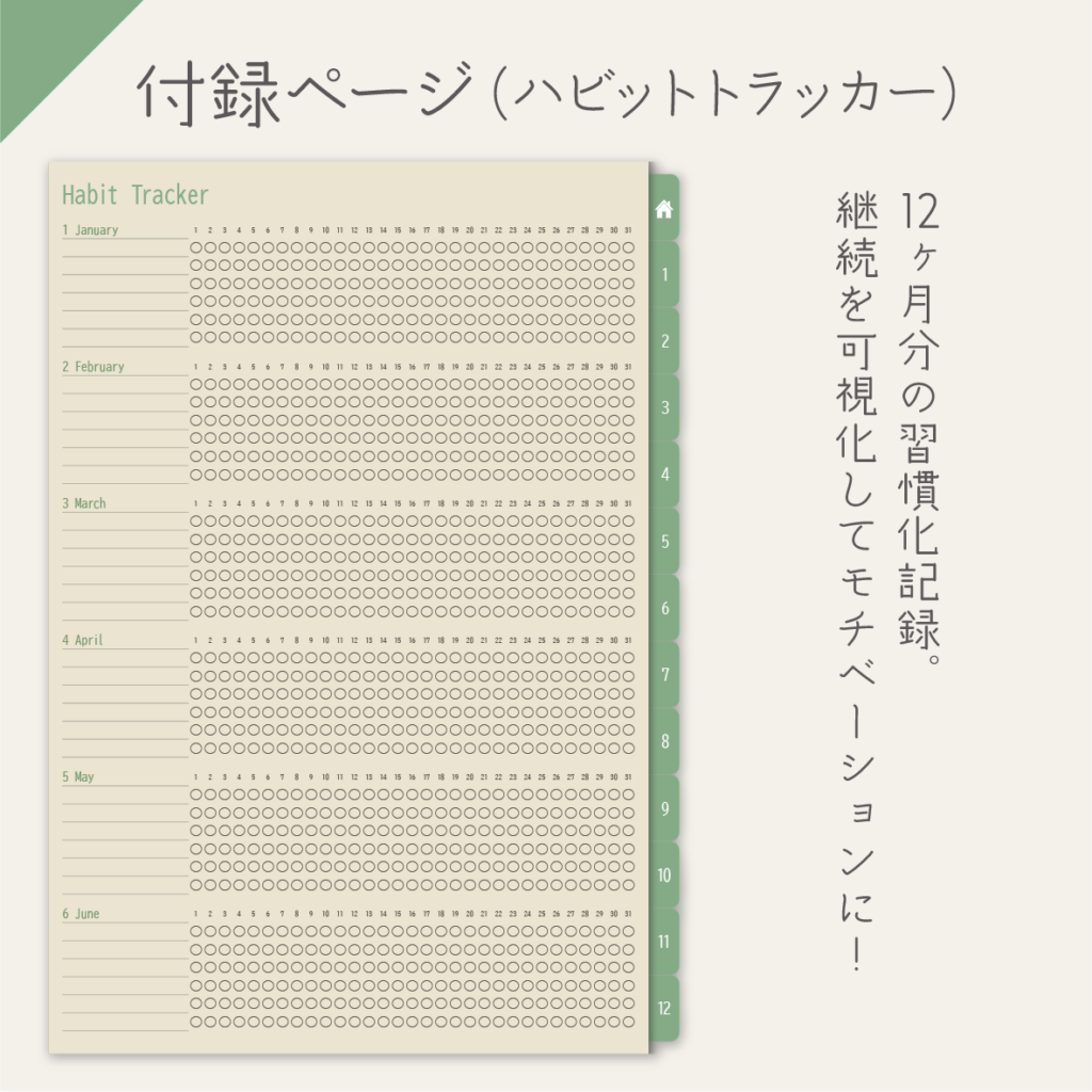 - 付録2:ハビットトラッカー 習慣化の進捗を月ごとに記録。
