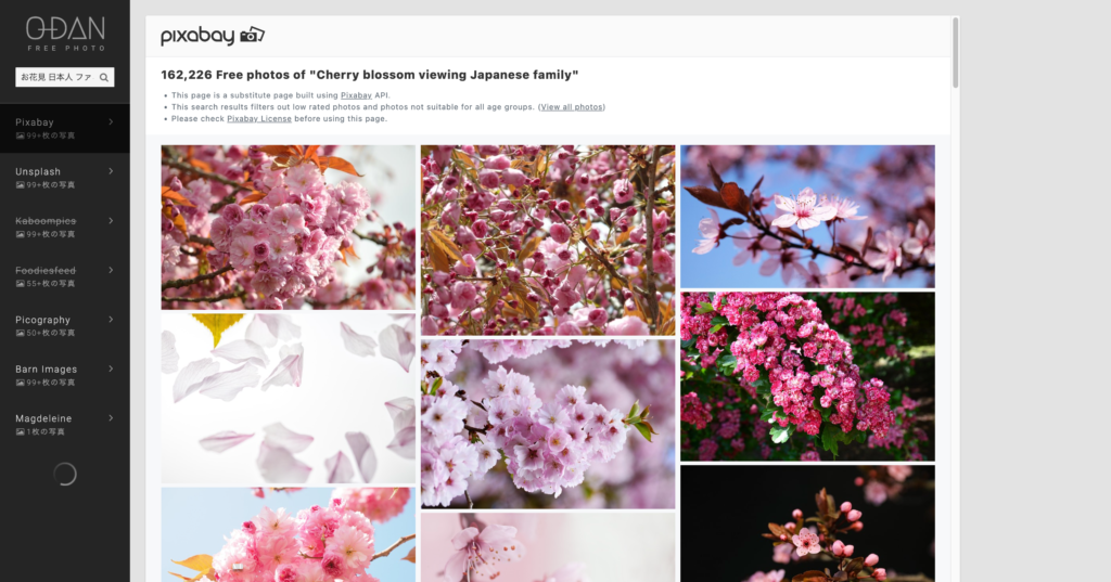 さすがに国産サイトだけあって、日本人が想像するお花見の写真が多数ヒットしました。