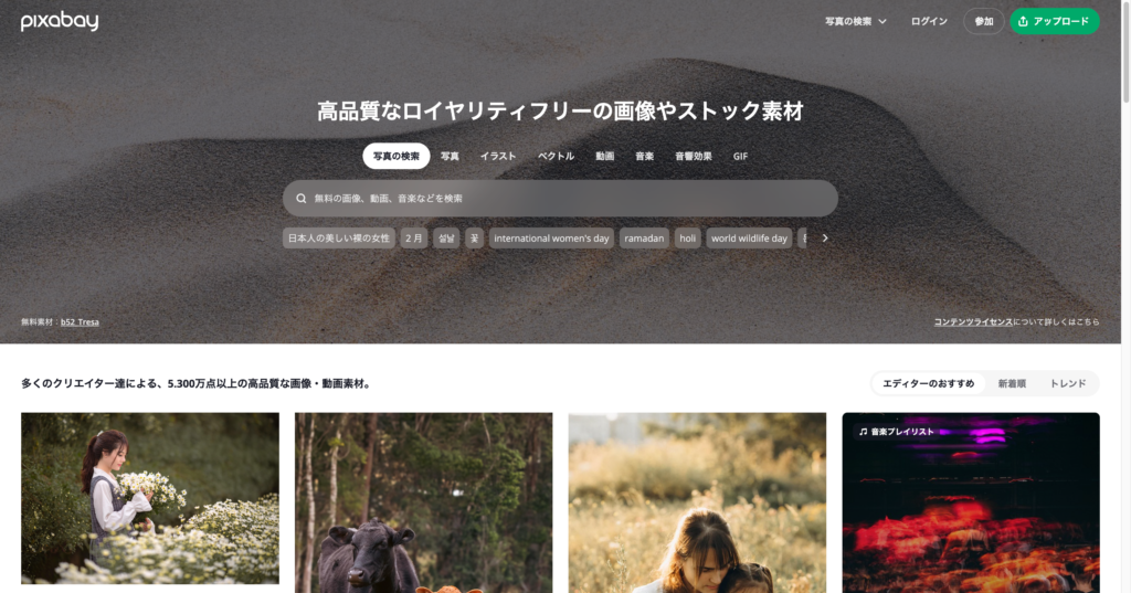 Pixabay少ない高品質な画像が多いが、日本人向けは少なめ