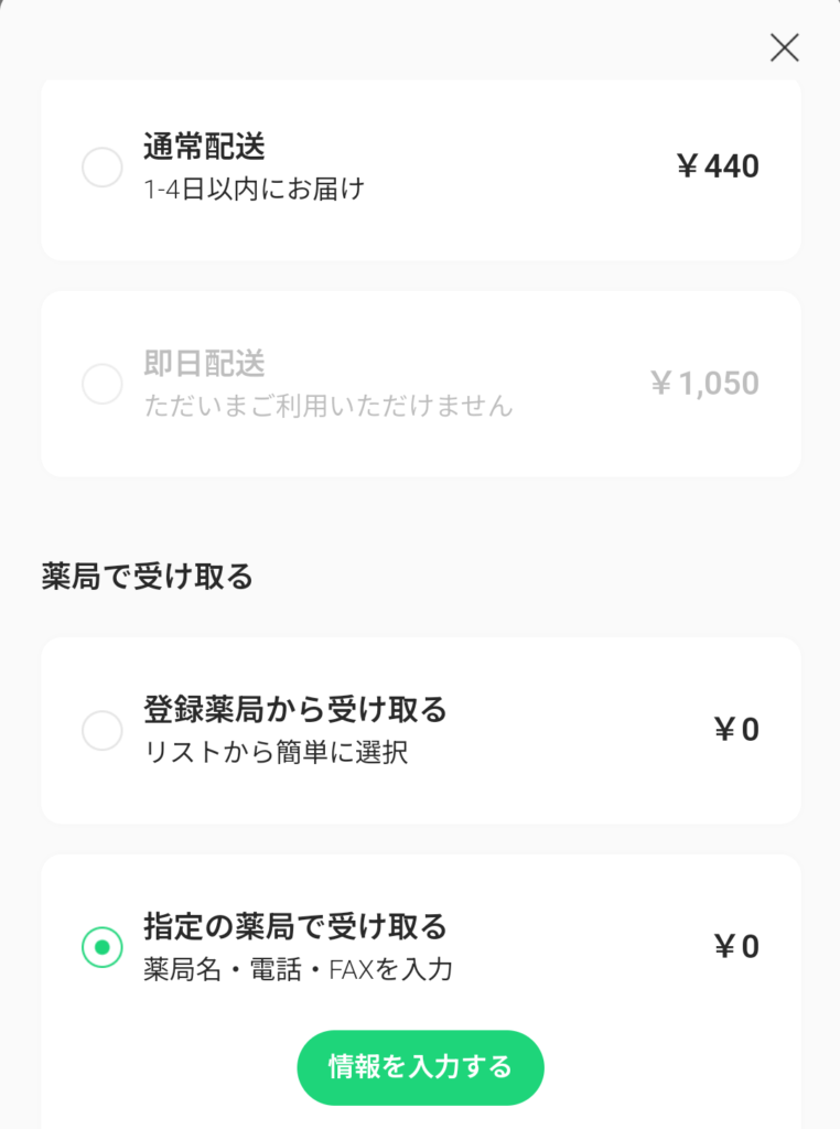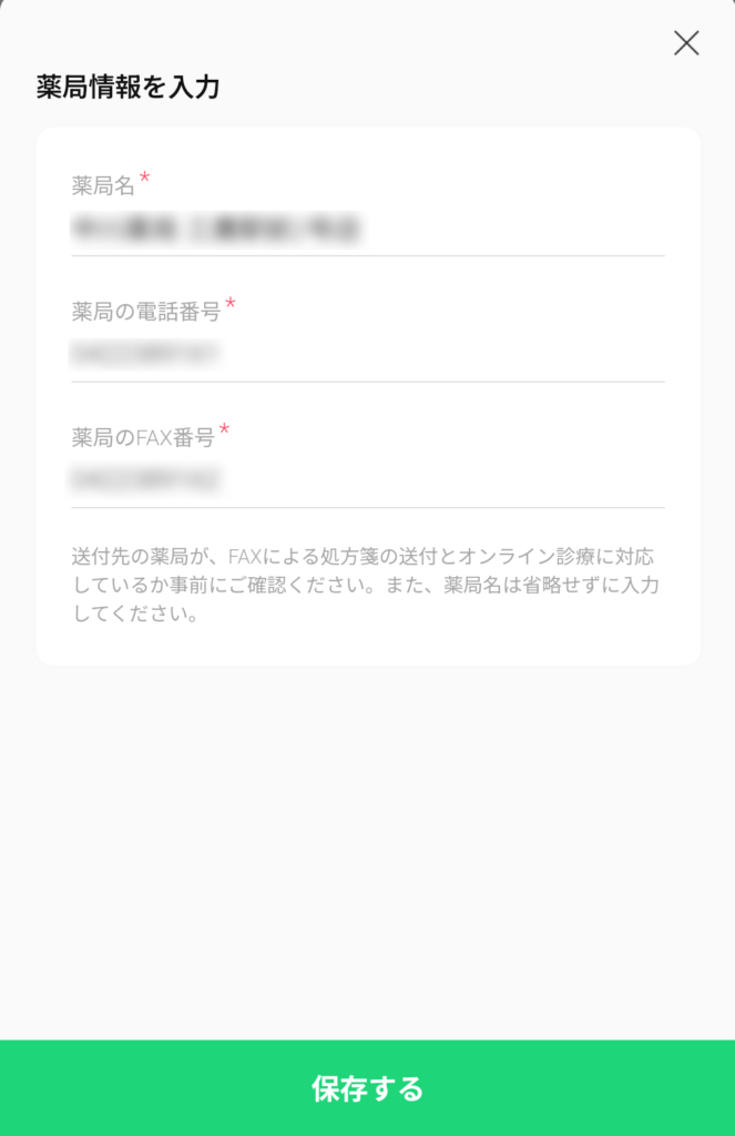 処方されるおくすりは配送で受け取ることもできますが、お近くの調剤薬局で受け取ることも可能です。その際は、FAXによる処方箋の送付に対応しているかどうかを事前に確認しておいてください。(ちなみに、私は確認せずに行きつけのかかりつけ薬局の情報を入れちゃいました)